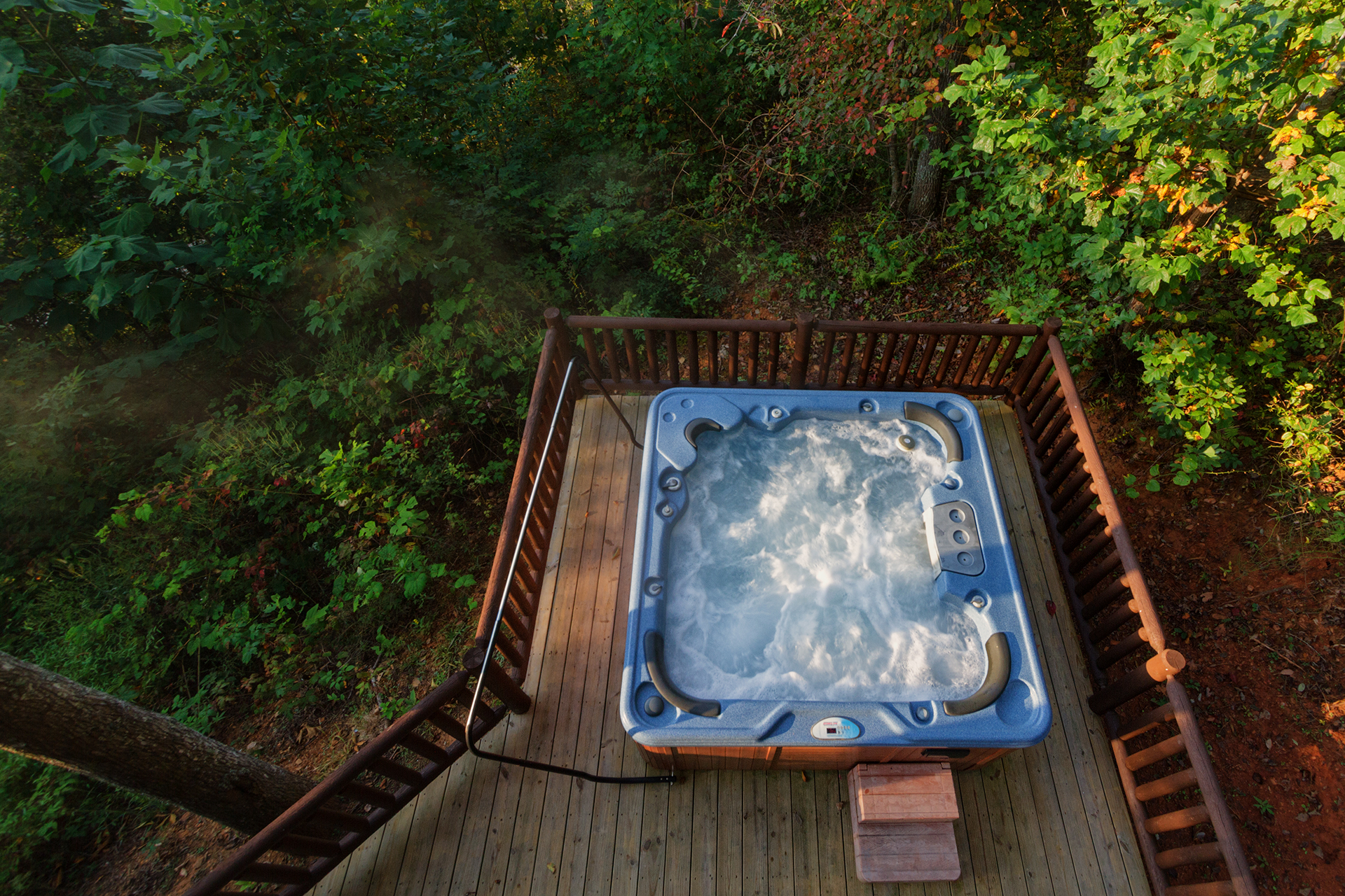 • The private out door hot tub and its surroundings viewed from the second bedroom balcony.