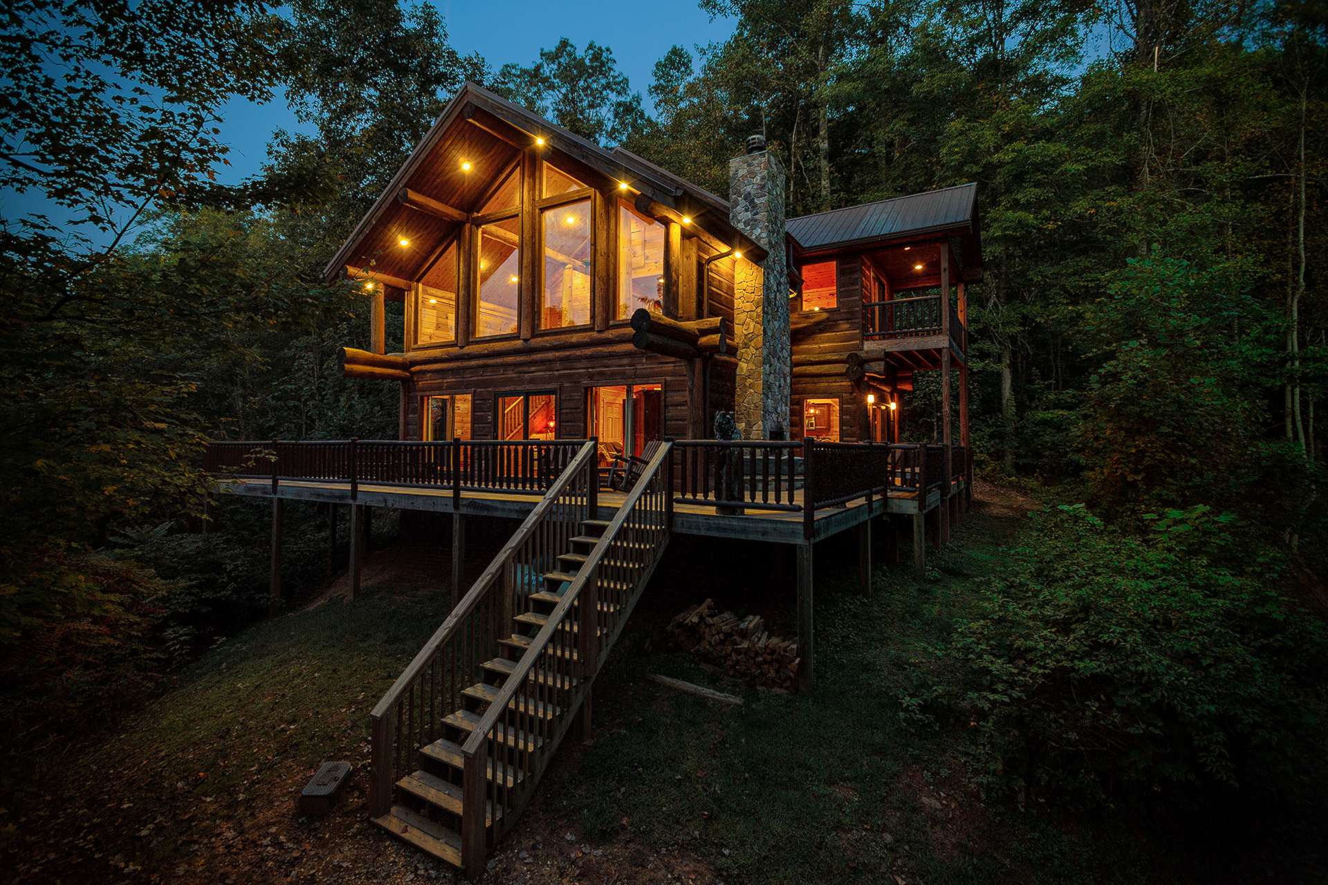 • Cabin in the Clouds glowing in the cool night time smoky mountain air.