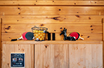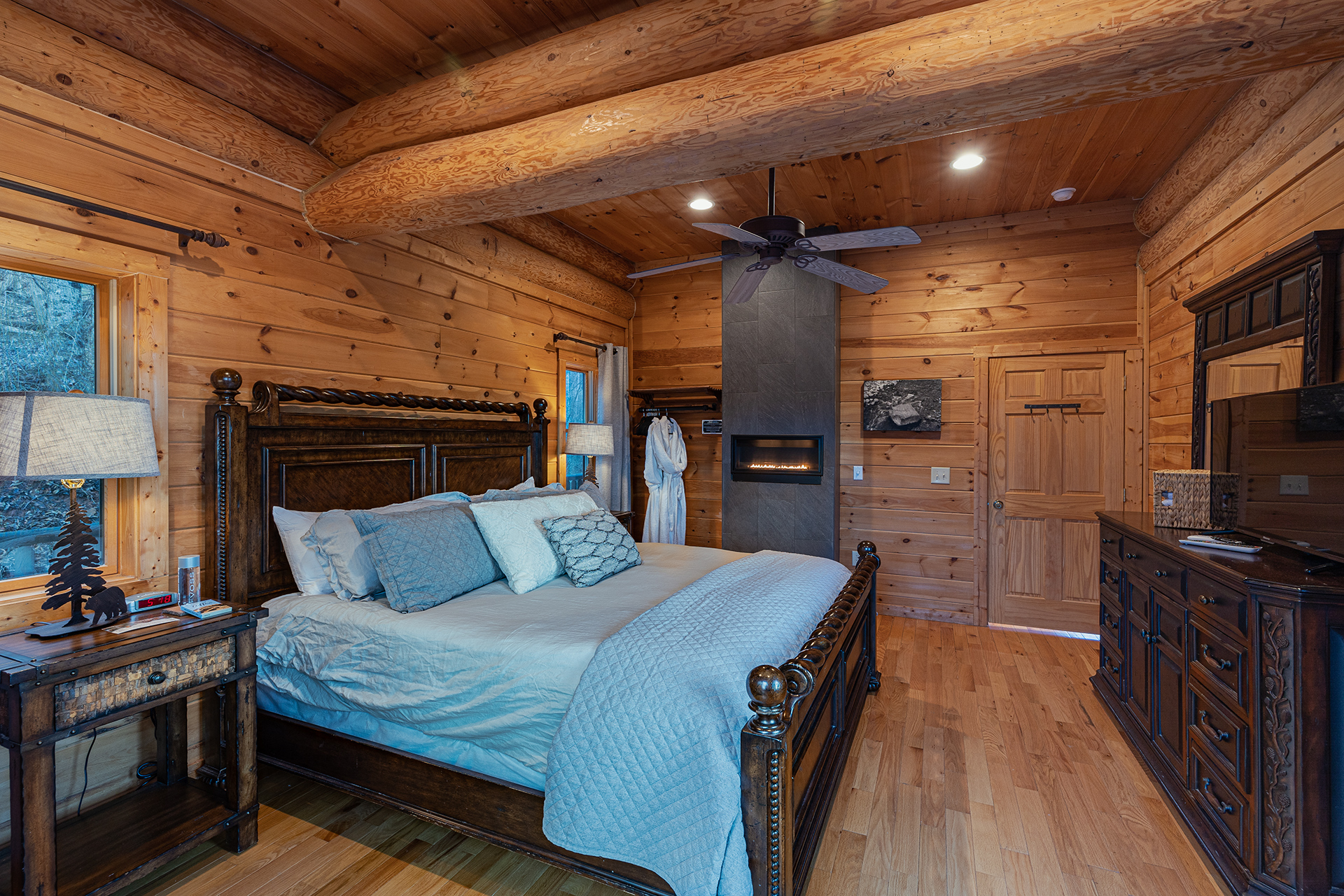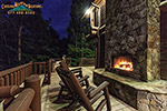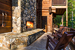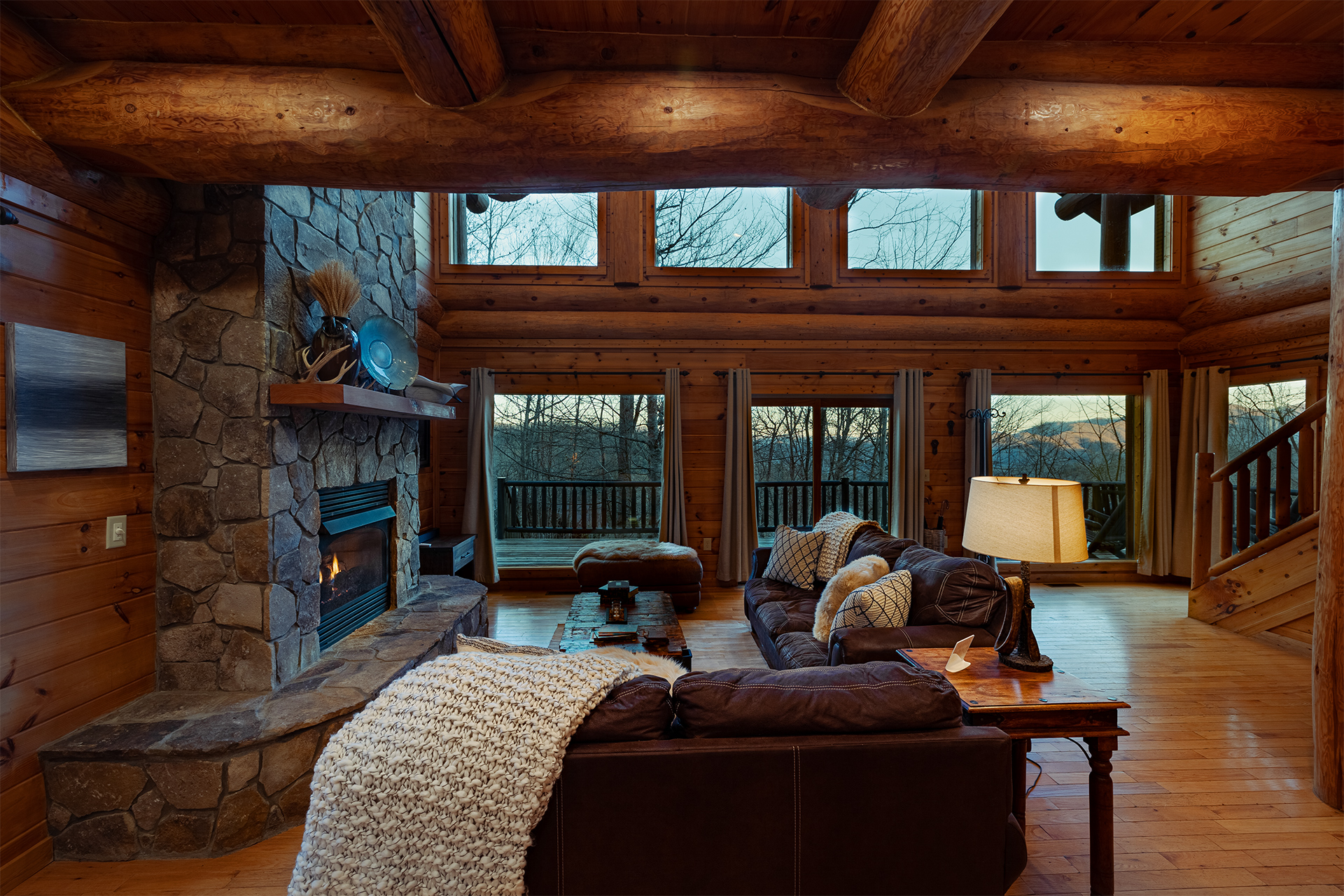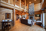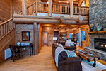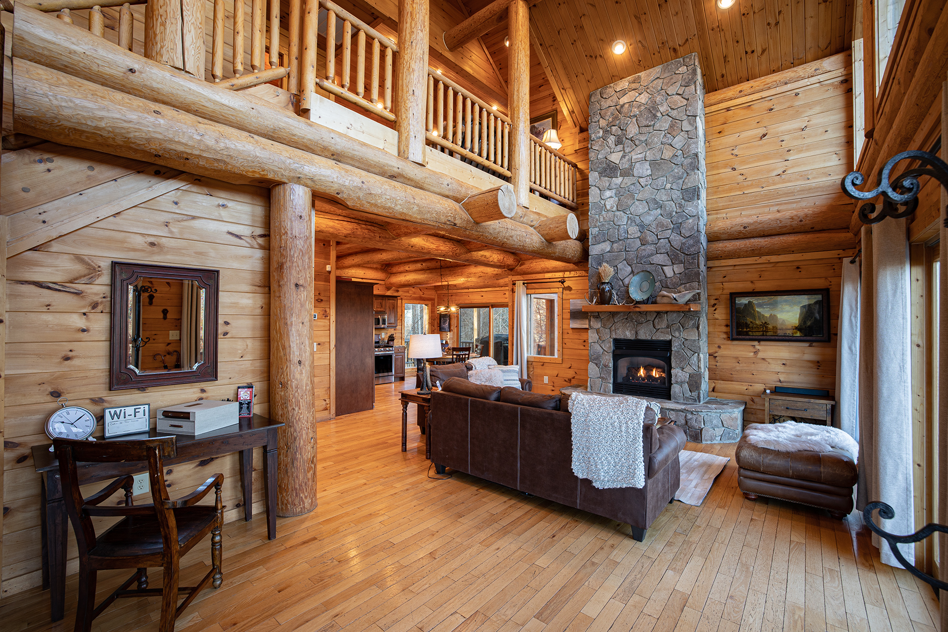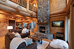 • Large log beams and stone gas log fireplace create a connection to the natural environment surrounding the cabin.