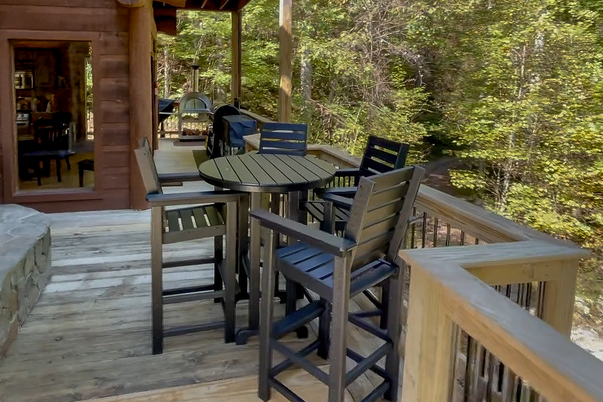 This spacious two story cabin is nestled in a grove of trees which provide privacy and add to its rustic charm. The cabin is surrounded by a spacious 360 wrap-around deck with plenty of seating options to take in the mountain air with your morning cup of coffee. Off the cabin's front corner, a distant mountain ridge peaks above the treetops. This same view can be enjoyed while relaxing in Polywood adirondack chairs by the gas fire table or from one of two second floor private balconies. Just steps from the ground floor master bedroom is a large hot tub with a Bluetooth speaker system. On the right side of the house, a large stone hearth with a gas fireplace provides the perfect spot to relax with friends or share a meal at the outdoor dining area after a day of exploring. Towards the rear of the cabin you'll find everything you need to make your culinary dreams come true, with a combination gas grill and pellet smoker. The setup comes complete with multiple pellet wood types in the provided dispenser, which doubles as a large work table for the grilling area. The true highlight of the outdoor cooking area is an Italian wood fired pizza oven. This unique feature offers an outdoor cooking experience that is guaranteed to make memories.