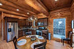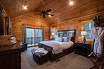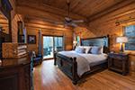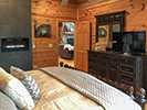 Stepping inside, you will quickly understand why this is one of the most popular cabins in the area. The spacious great room features cathedral ceilings with a full wall of chalet style glass windows, which bathe the cabin’s rich exposed log beams in daytime sunlight. In front of a massive stone fireplace are comfortable leather sofas with plush throws, ready for you to curl up with a good book or to settle in to watch your favorite movie. The chef-inspired kitchen is stocked with everything you need to create gourmet delights. The cabinets are filled with everything from spices to specialty culinary tools, including high end cookware, a mixer, waffle iron, and even an ice cream maker. The kitchen features a modern gas range with convection oven, as well as a dishwasher.  Located just off the great room is the spacious master bedroom with a king bed, set with luxurious bedding. The bedroom is highlighted by the elegant wall mounted gas fireplace, perfect to warm yourself by after a late night soak in the spa -- found just outside the bedroom’s doors. The main level also features a full bath with luxury linens and amenities, as well as a utility room with available washer and dryer. If you must log in to your work email while away, a desk and chair are located in a nook beside the staircase, and the cabin is connected with WiFi internet.
