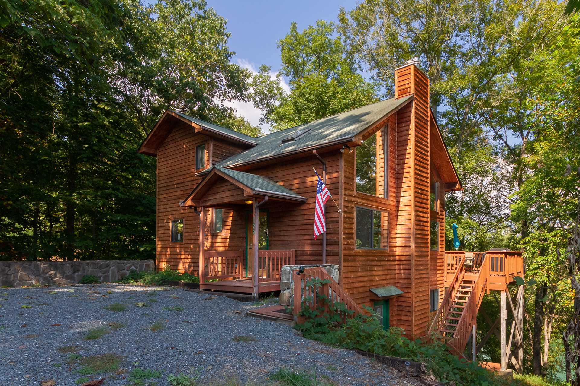 This multi-storied home features all new wood siding, giving it a rustic appeal, with a special treat of a combined screened in porch with comfortable chairs and love seat for whiling away the afternoon; and an open deck with a hot tub and outdoor dining for six. Though neighbors may be near, the view from the deck and porch is shaded, and secluded- looking out through the trees over Fontana Lake and the Great Smokey Mountain Railroad. The drive features ample parking for two vehicles.