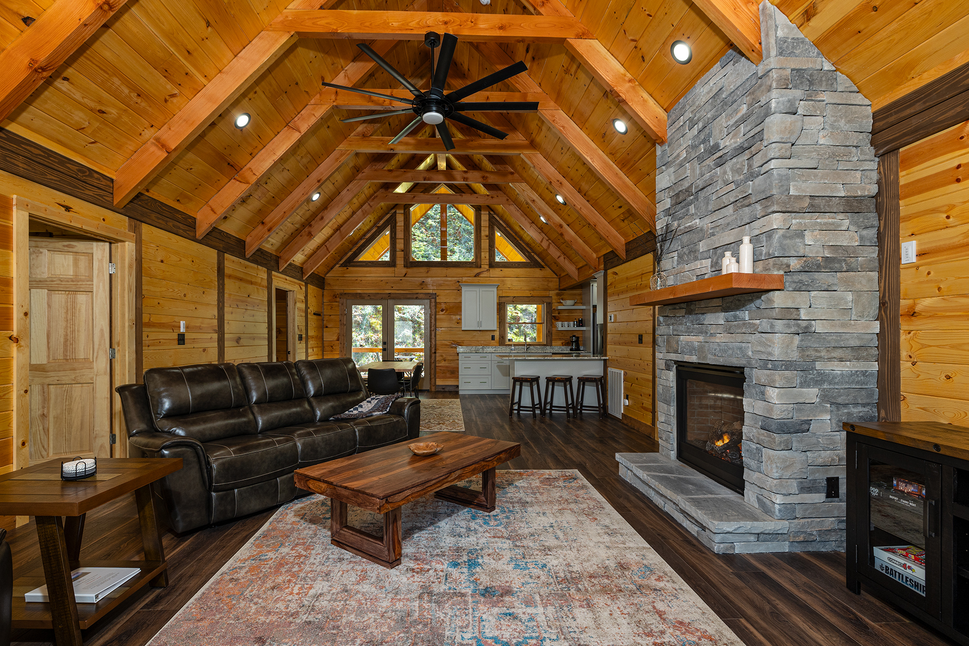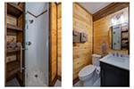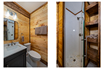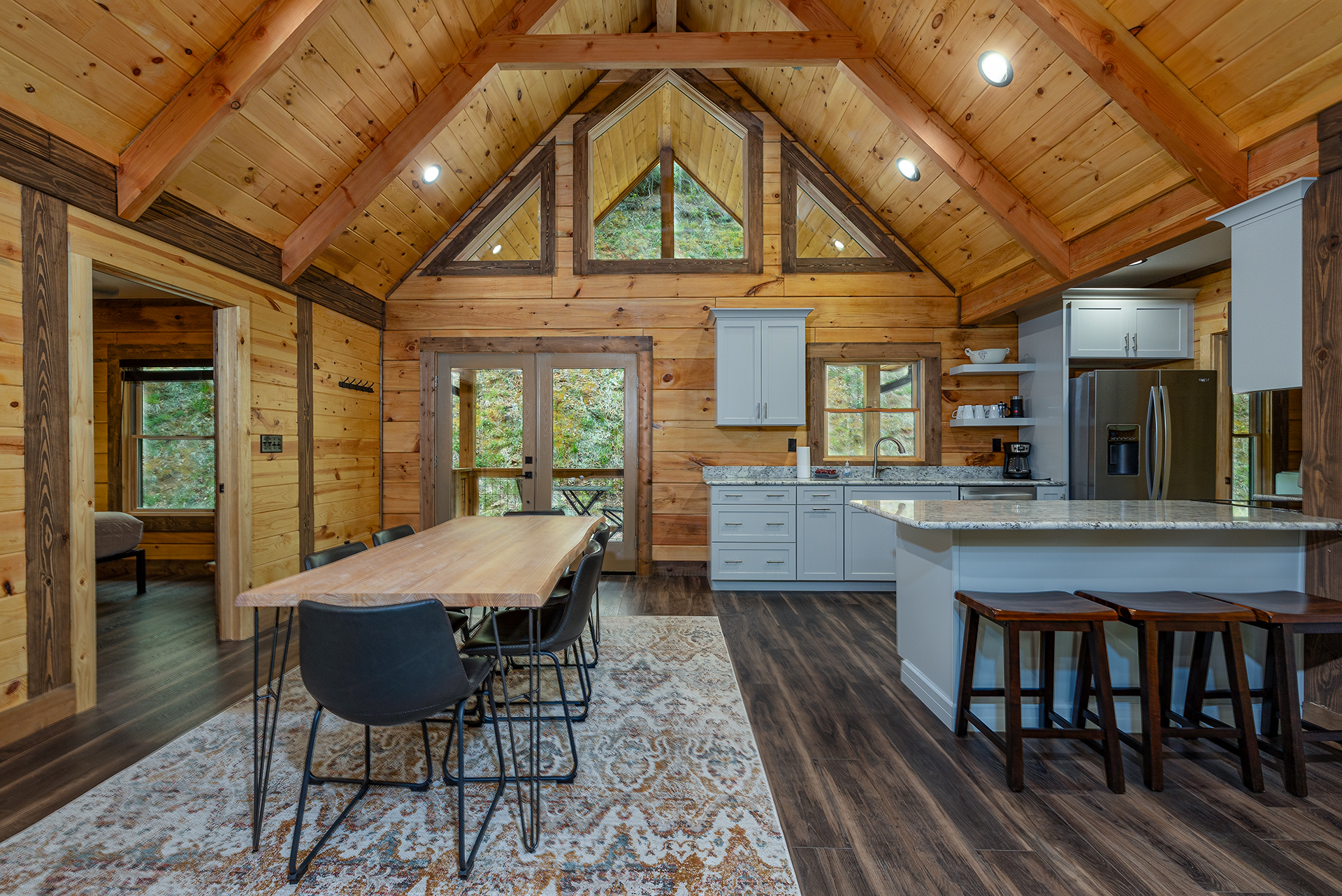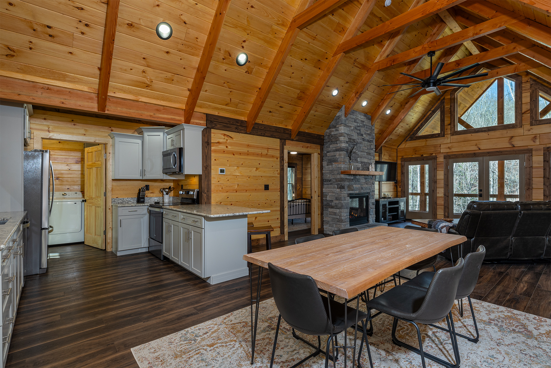 With its natural wood accents, soaring windows, and vaulted ceilings, this cozy cabin exudes an aura of warm hospitality and relaxation. The well-appointed kitchen is complete with stainless steel appliances and stocked to accommodate all your culinary needs for a delightful vacation experience. Whether you prefer casual barstool seating in the kitchen or a more formal dining setting at the adjacent table for six, the options for enjoying meals are plentiful. Adjacent to the kitchen is the living room, beckoning with plush recliner seating arrangements encircling a cozy fireplace and TV with streaming service capabilities, offering the perfect setting for endless relaxation. French doors seamlessly connect the indoor and outdoor spaces, inviting you to extend your leisure onto the deck. The cabin also provides three bedrooms, each boasting its own private ensuite bathroom. The master suite offers a sumptuous king-size bed, while the additional bedrooms are furnished with comfortable queen-size beds, ensuring a restful night's sleep for all guests.