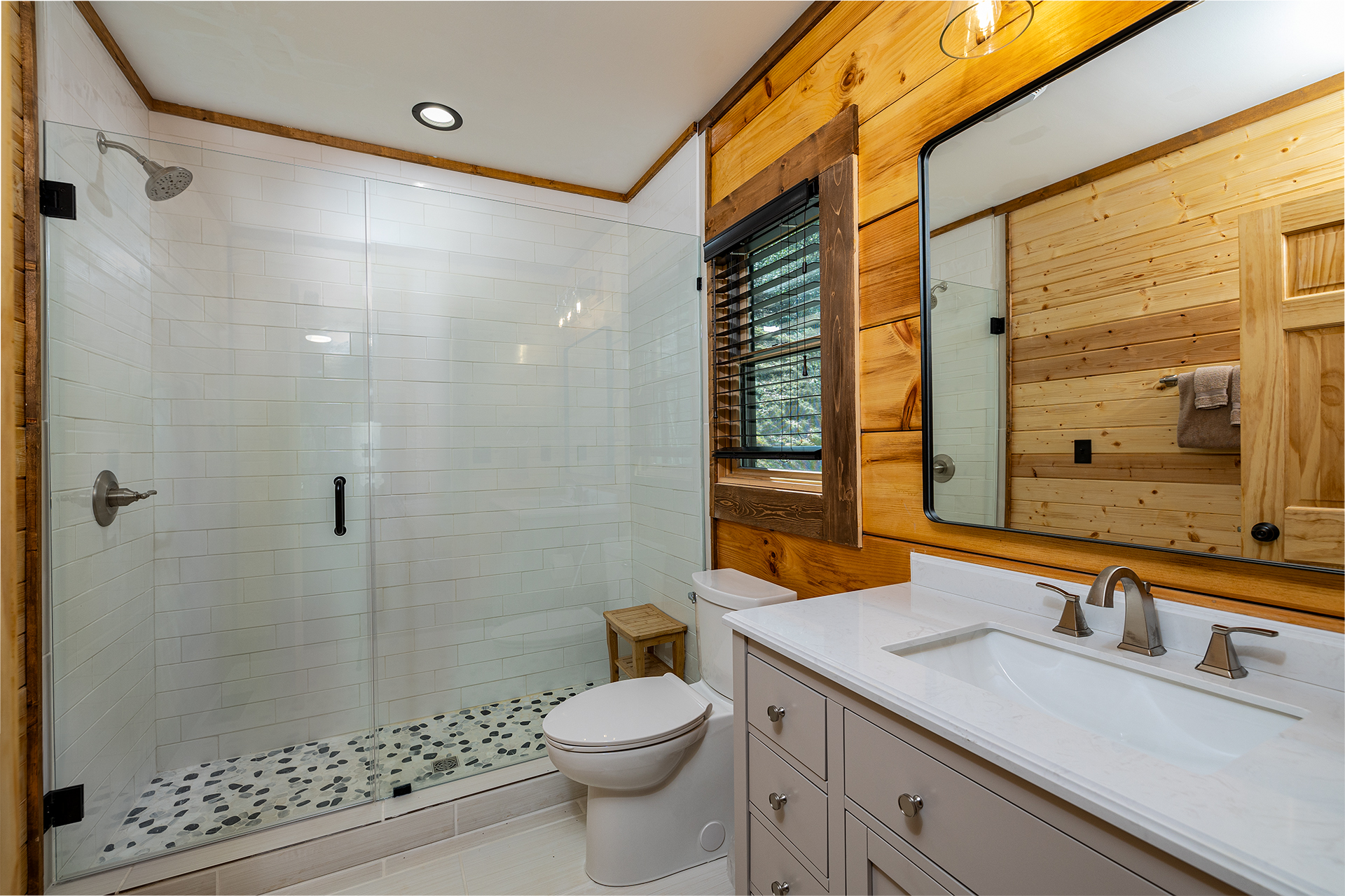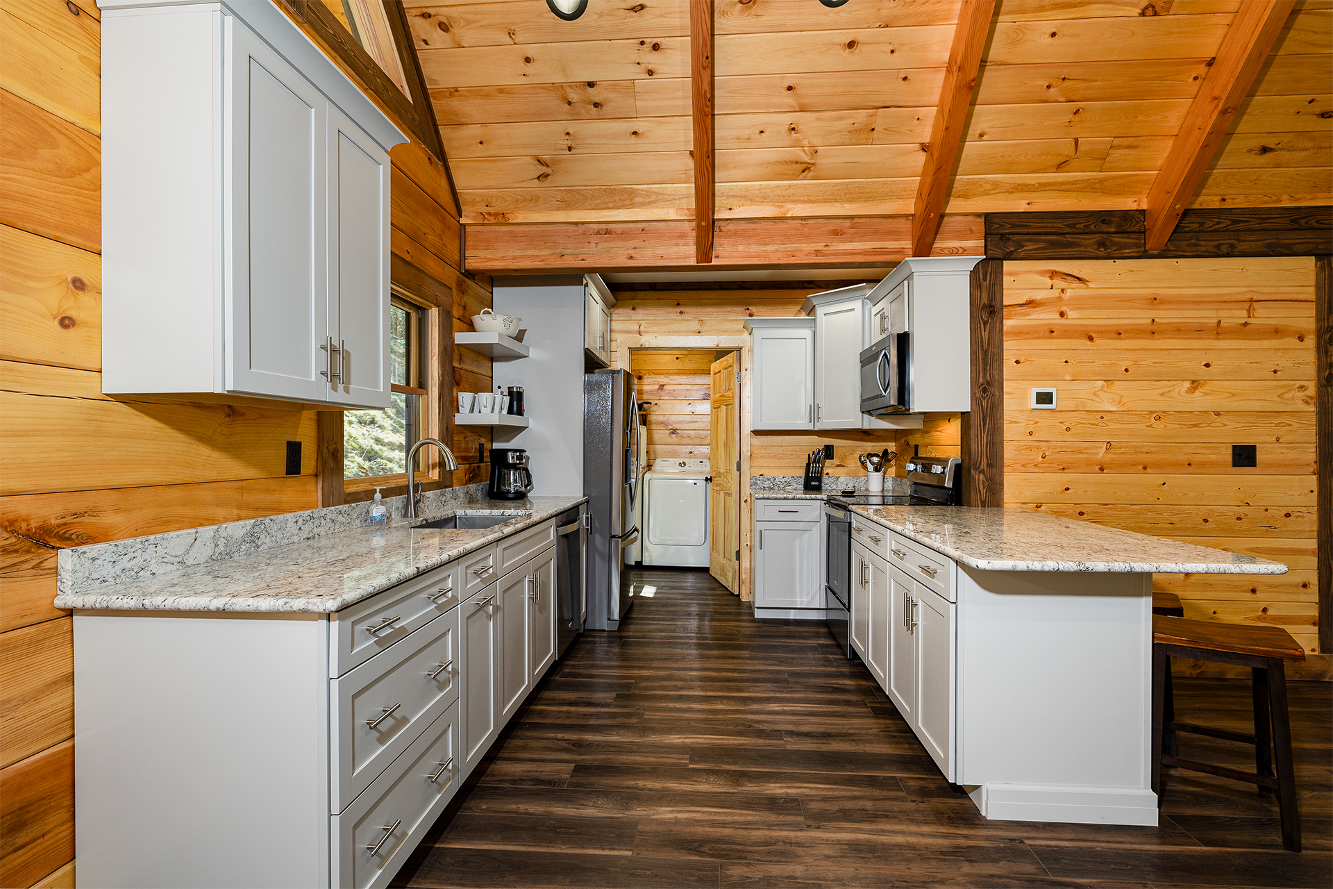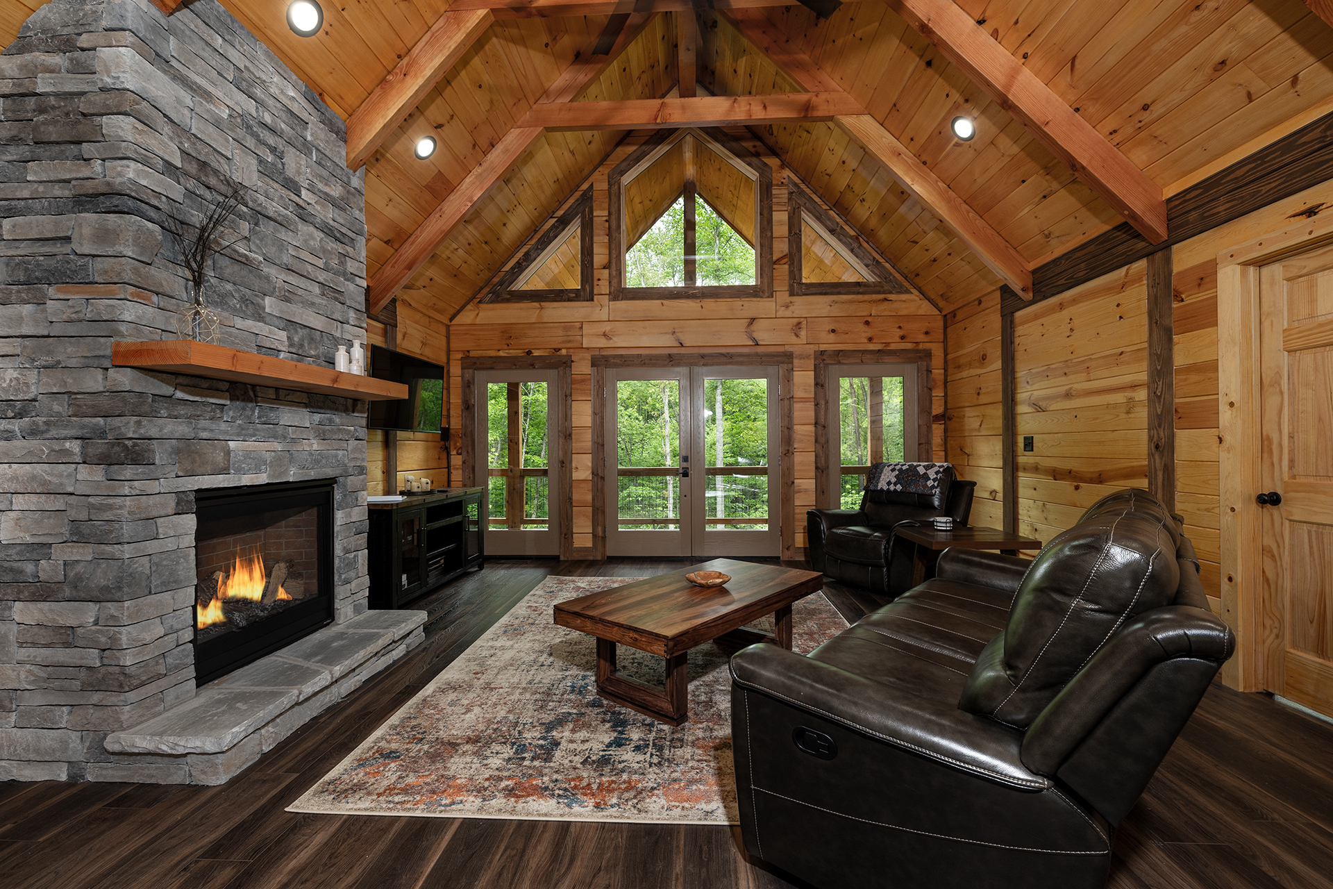With its natural wood accents, soaring windows, and vaulted ceilings, this cozy cabin exudes an aura of warm hospitality and relaxation. The well-appointed kitchen is complete with stainless steel appliances and stocked to accommodate all your culinary needs for a delightful vacation experience. Whether you prefer casual barstool seating in the kitchen or a more formal dining setting at the adjacent table for six, the options for enjoying meals are plentiful. Adjacent to the kitchen is the living room, beckoning with plush recliner seating arrangements encircling a cozy fireplace and TV with streaming service capabilities, offering the perfect setting for endless relaxation. French doors seamlessly connect the indoor and outdoor spaces, inviting you to extend your leisure onto the deck. The cabin also provides three bedrooms, each boasting its own private ensuite bathroom. The master suite offers a sumptuous king-size bed, while the additional bedrooms are furnished with comfortable queen-size beds, ensuring a restful night's sleep for all guests.