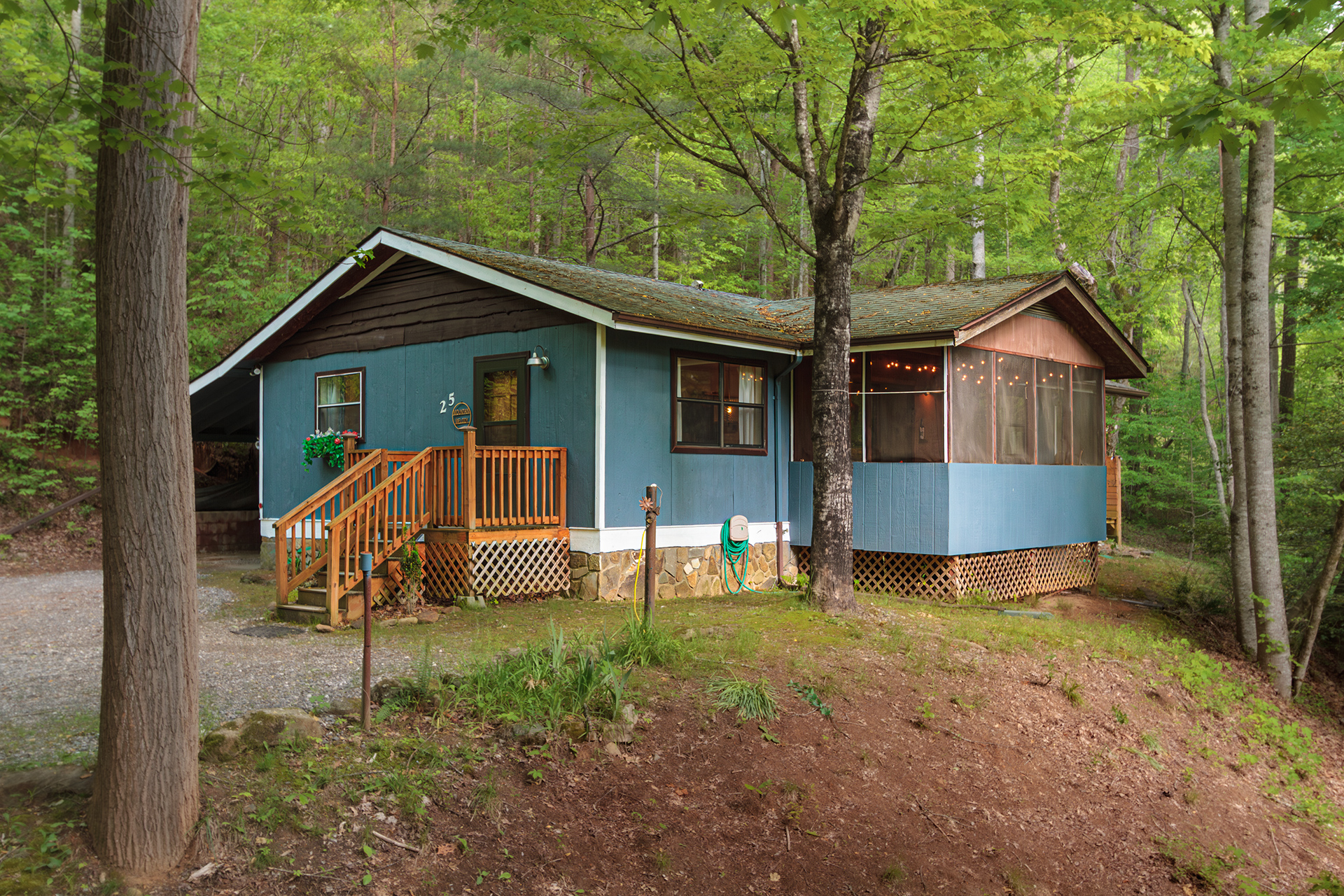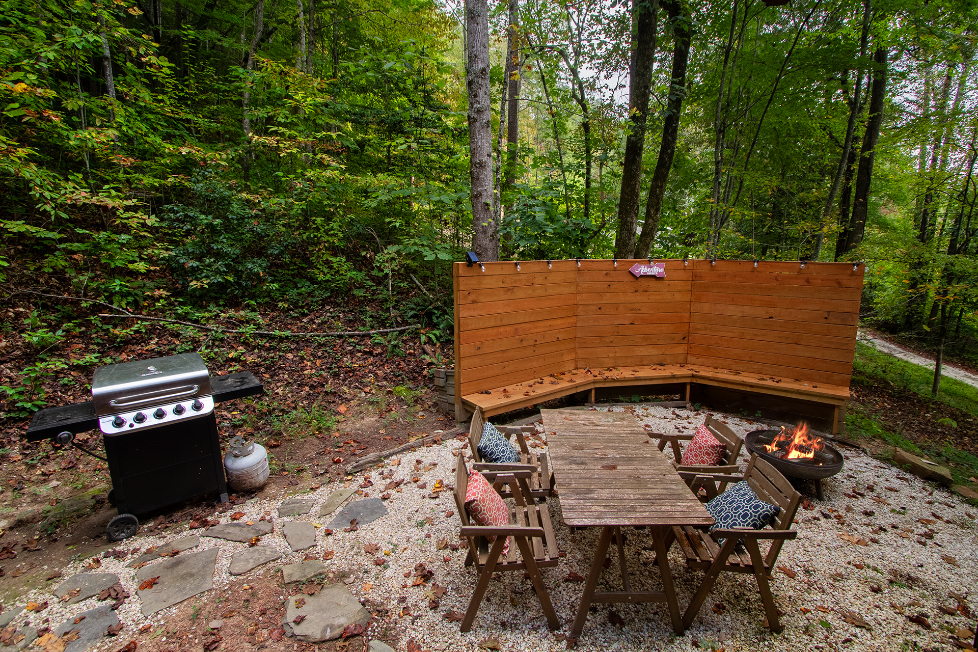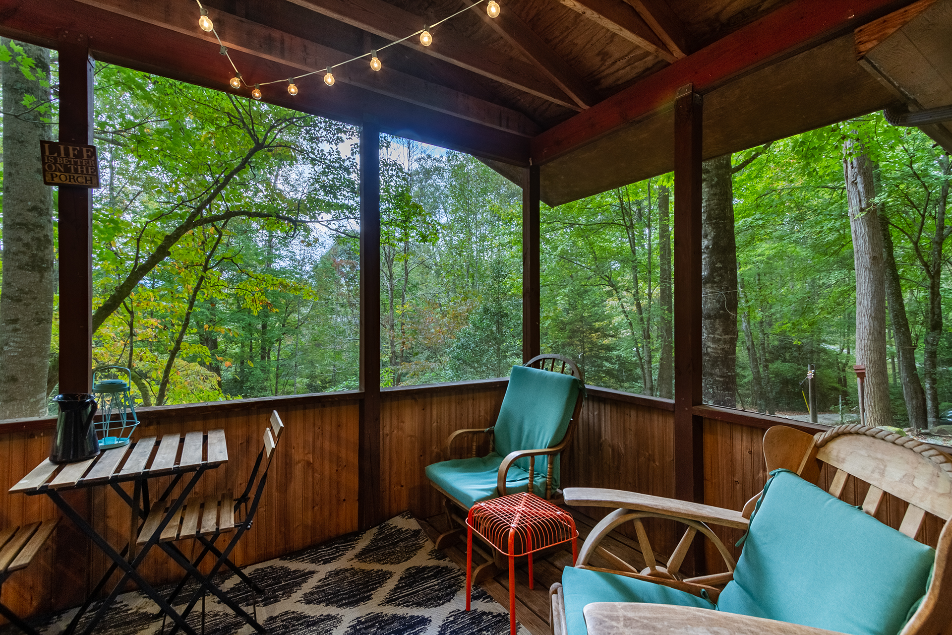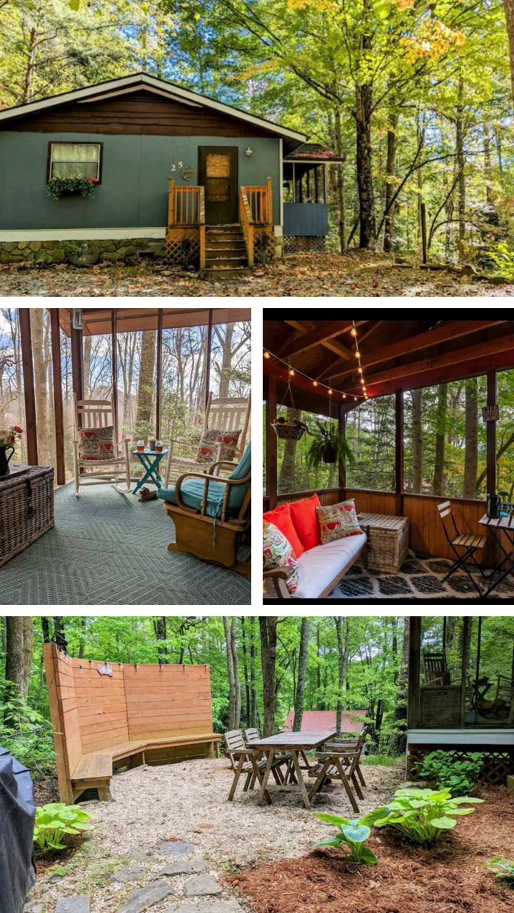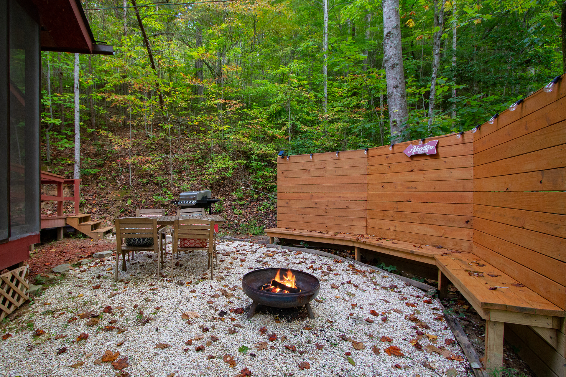 This is a singular level cabin with just a small set of stairs to climb on the porch leading to the entry way door. There are two screened in porches furnished with rocking chairs and tables for you to kick back and enjoy the tranquil sounds of the mountains that surround you. This cabin has a wonderful and unique backyard that is equipped with a gas grill, and outside table for tasty al fresco dining and plenty of bench seating surrounding the fire pit.