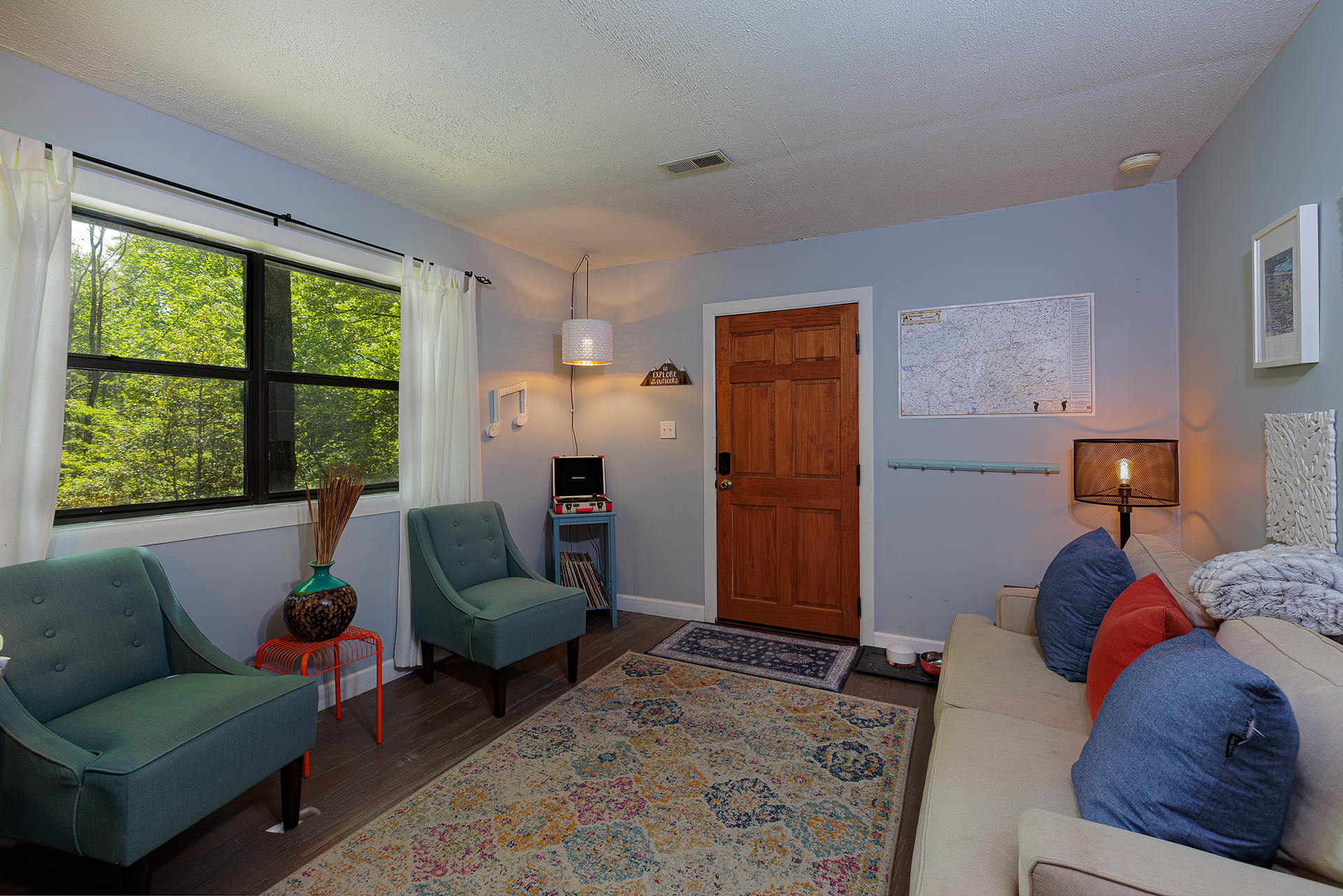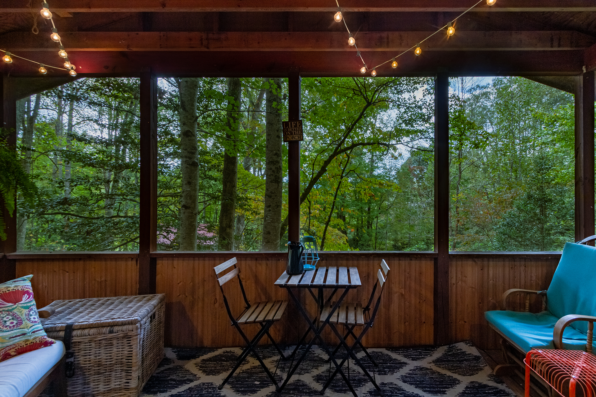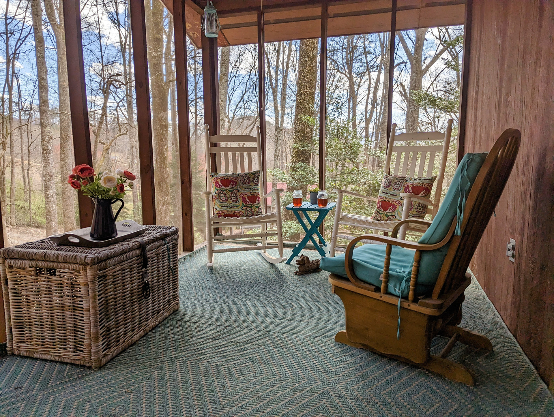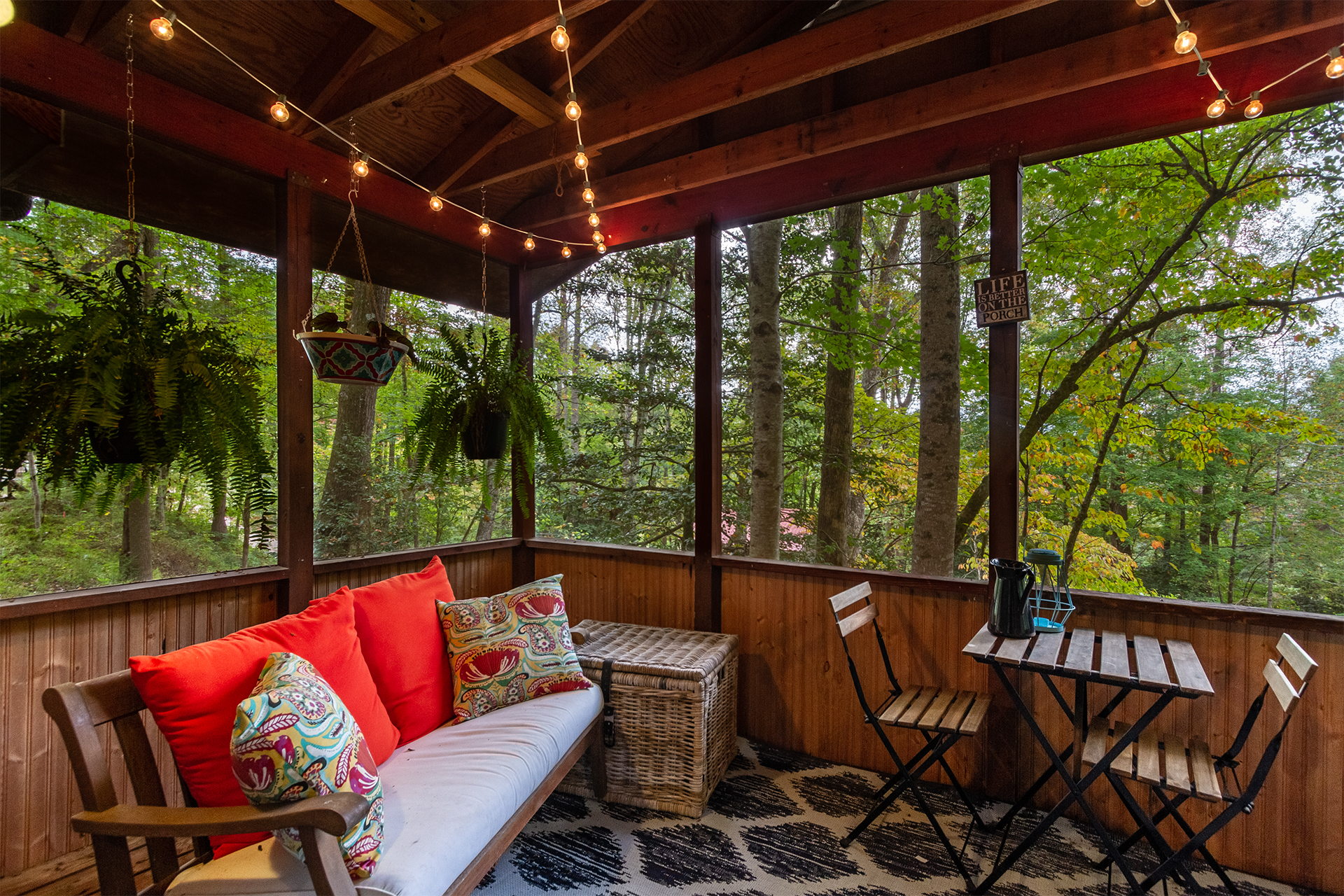 This is a singular level cabin with just a small set of stairs to climb on the porch leading to the entry way door. There are two screened in porches furnished with rocking chairs and tables for you to kick back and enjoy the tranquil sounds of the mountains that surround you. This cabin has a wonderful and unique backyard that is equipped with a gas grill, and outside table for tasty al fresco dining and plenty of bench seating surrounding the fire pit.